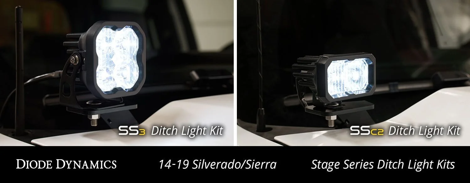 Perfect fitment. The Stage Series Backlit Ditch Light Kit for the 2014-2018 Chevrolet Silverado 1500 and 2019 Silverado 1500 LD allows you to easily mount two SS3 or SSC2 Pods above the hood. These application-specific brackets were CAD-designed to install using factory mounting points. No cutting or drilling required! This kit features a low profile design while minimizing glare, and will not interfere with raising or lowering the hood.