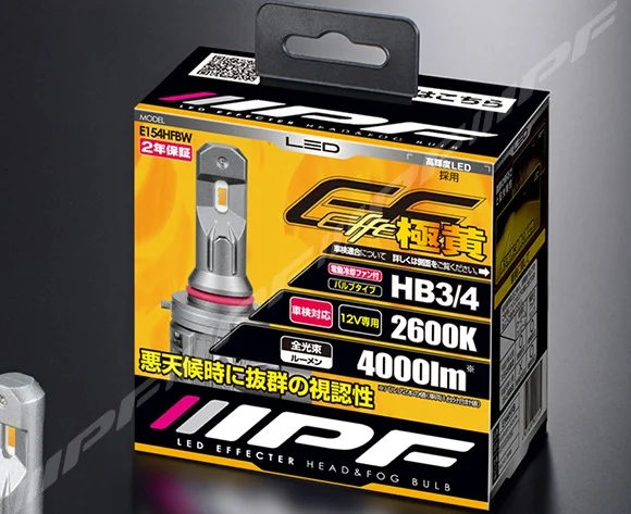 Introducing the IPF LED Effecter Head & Fog Bulb 2600K Series, featuring a deep yellow "Gokuki" color temperature of 2600K (Kelvin) that excels in bad weather conditions, making it especially effective in foggy conditions. These single-type bulbs are designed to replicate the look of classic halogen bulbs, making them suitable for nostalgic car enthusiasts and drivers seeking enhanced visibility during night driving.