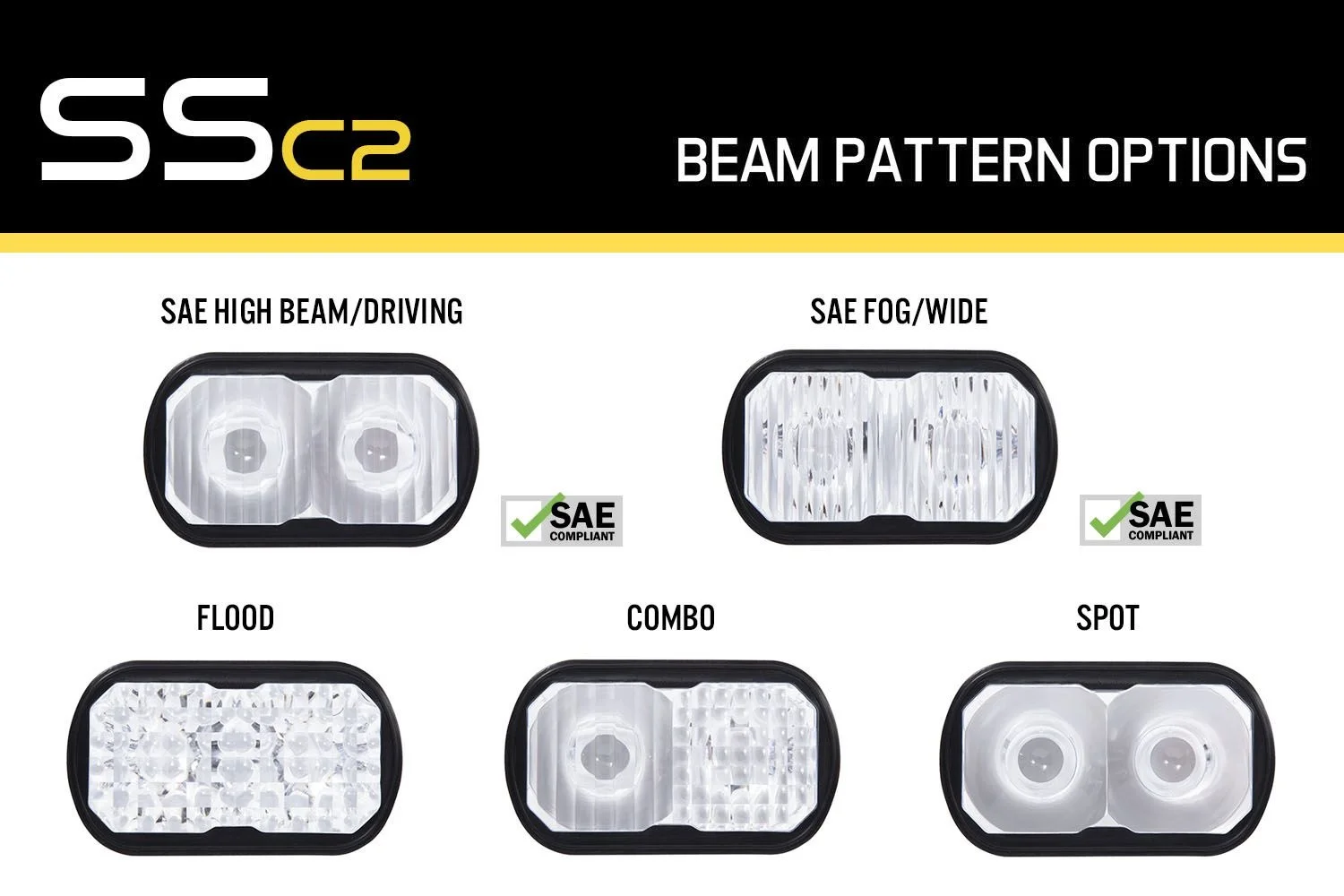 Combo pattern combines both the Driving and Flood optics. It shines light downrange in a focused, rectangular 40x20 degree pattern. The SSC2 Pod features a single flood optic on one side with a single driving optic on the other.