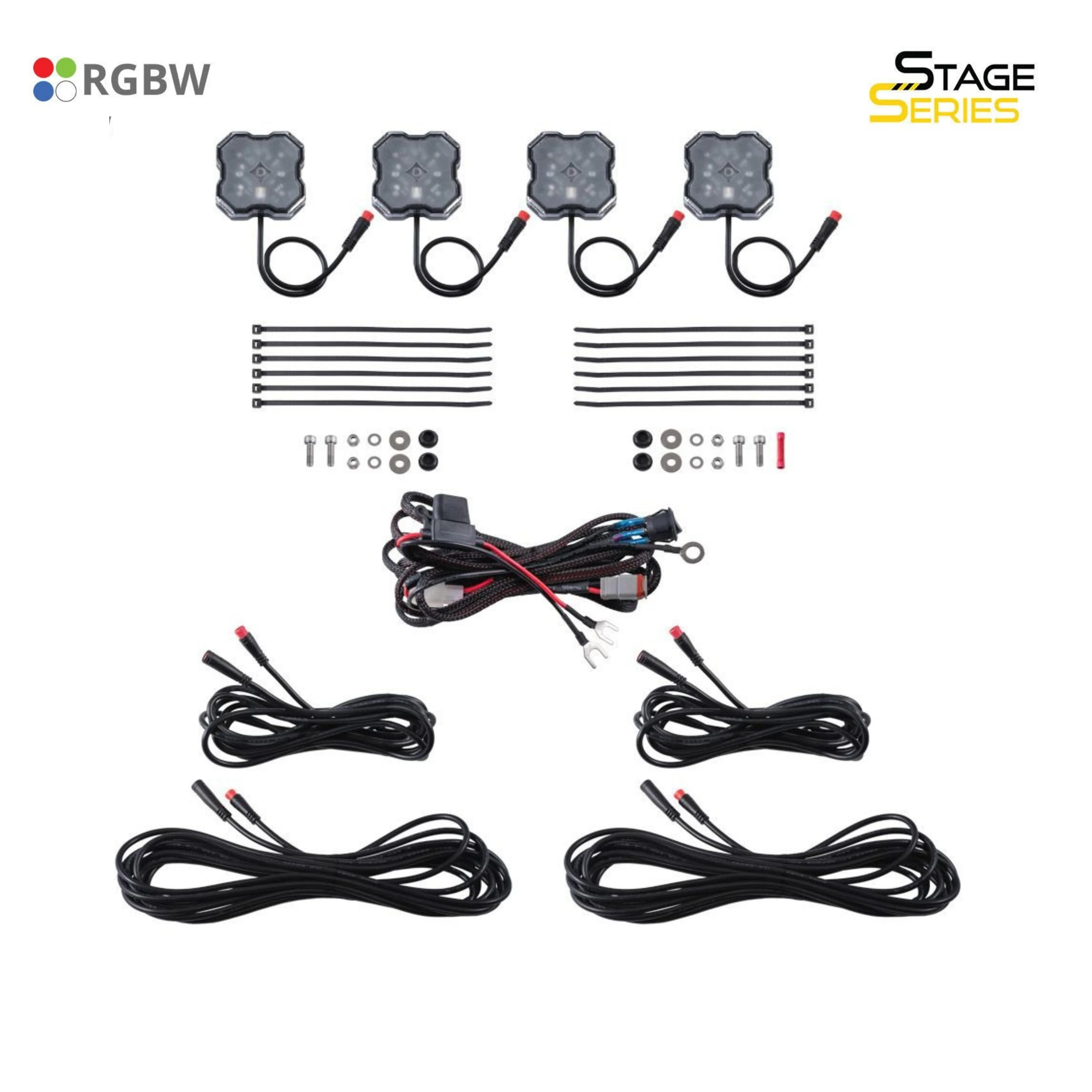 Multicolor plus White. With four high-intensity RGBW LED emitters, the Diode Dynamics Rock Light provides plenty of output in any color you can think of, paired with our RGBW remote or RGBW Bluetooth controller and app. The diffused optical feature of the lens provides excellent integration of colors. And unlike other multicolor lights, the extra white chip means that these will light up in a bright, pure white color when you want to maximize output. Want to show off? Use your controller to start a pattern, strobe, fade, or control the brightness. The best of both worlds! Our RGBW rock lights pack a punch, but if you are looking for the most output possible, check out our single-color rock lights!