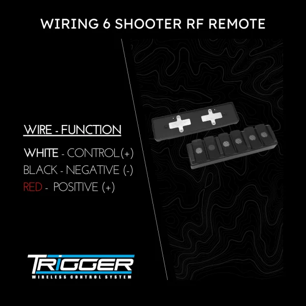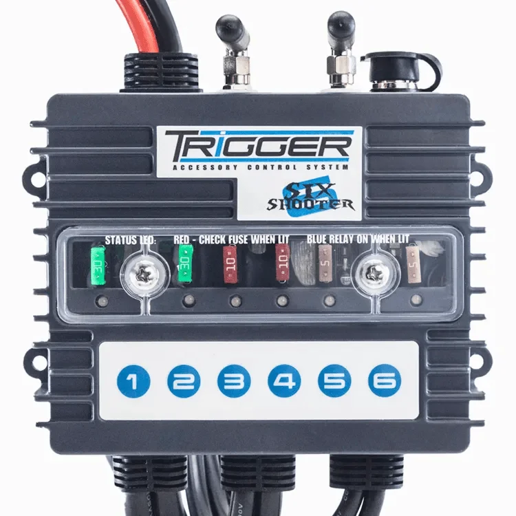 TRIGGER 6 SHOOTER Wireless Accessory Control SystemThe included battery-powered RF remote utilizes a universal mounting system that will accommodate round surfaces as well as flat surfaces. Its buttons are back-lit and it is programmable for security or use with additional remotes. Several Trigger control boxes and remotes can be used together to control up to 24 accessories. When mounted to a UTV roll bar, the buttons on the remote are more easily accessible than dash switches. No straining against seat belts to reach the dash, just a quick reach up to tap the remote.