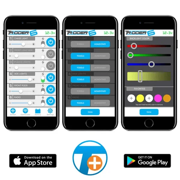 Accepts 12-24 Volt inputTwo 30, two 10, and two 5 amp fused circuitsBuilt-in Bluetooth battery monitor – see connected battery voltage in real-time on the TRIGGER ACS PLUS appIncludes six 8-foot-long wire harnesses with waterproof connectorsWireless back-lit RF remote rocker switch moduleSet custom backlight colors on the remote!Backlit switches when optionally connected to 12 Volt power via an 8′ long, thin 28 gauge harnessYou can control it from your mobile device with our free TRIGGER ACS PLUS App for iOS/Android!Comes with switch labels too!NOW FEATURED IN ‘THE SHOP’ MAGAZINE! CLICK TO CHECK OUT THE ARTICLE!Need a longer wire run? Additional TRIGGER Wiring Harnesses are also available, click here to shop.